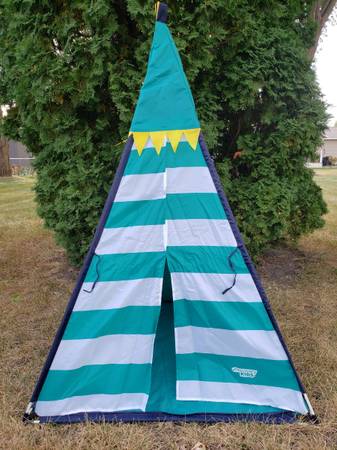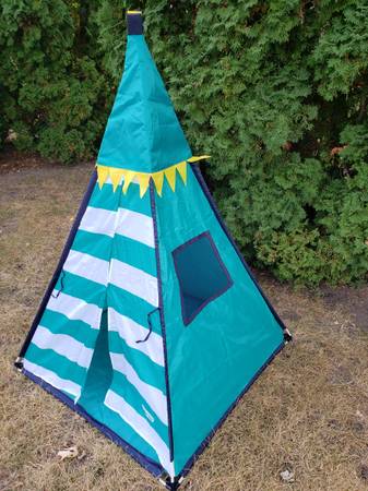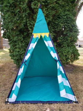 This tepee tent is teal with white and yellow accents. Safe zipper free door for kids; the front flaps velcro together and can be tied back when opened. There is a mesh window on one side.. Tent has a quick and easy set up. Stands over 4.5' tall. It is perfect for pretend play or as a reading fort. For ages 4 and up. Tent is in excellent condition. Note: it is pictured outside, however, it was only ever used inside.