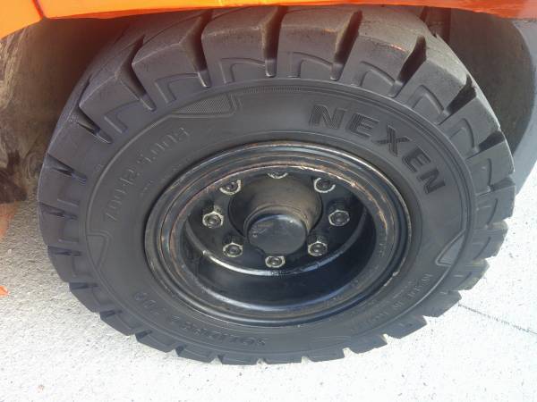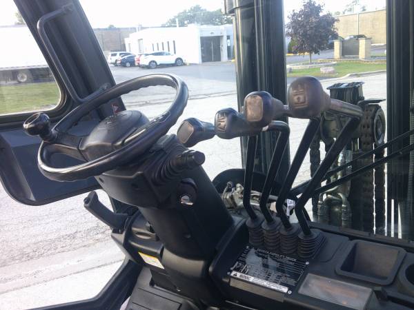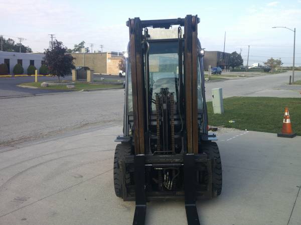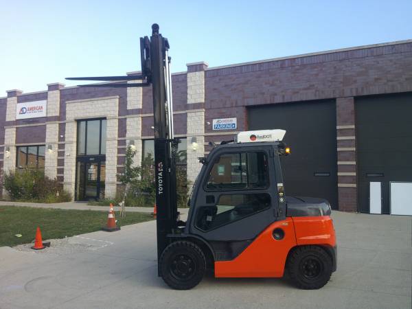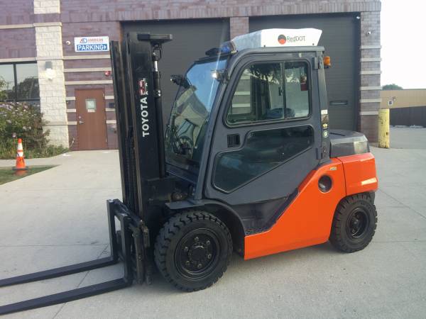 8K LB. Capacity Pneumatic Toyota Forklift, Model # 8FD40U, diesel powered, solid pneumatic traction tires, inside outside truck, very well maintained, full cab with removable doors, fully loaded, heater, air conditioning, fan, windshield wipers, turn signals, digital display, lights, strobe light, back up alarm, premium seat, front & rear blue safety spotlights, onboard fire extinguisher, two tier full free mast, max lift height is 11' high, side shift, 48" forks, ready for duty, we can deliver, come take a test drive at the warehouse, asking $14,985., contact is Tim.
