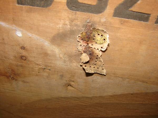 It still has a stapled partial perforated paper label that probably has the same information as is on the bottle labels plus other printed information and decoration as shown in photo's. The other end a painted globe that has an S stamped over the world logo with an arrow pointing down. The edge of the logo is missing some top color and is white which I beleive reads TRADE MARK and some other info I could not make out. This is possibly identification relating to the new prohibition laws.