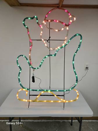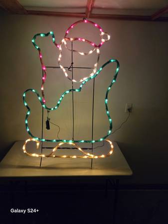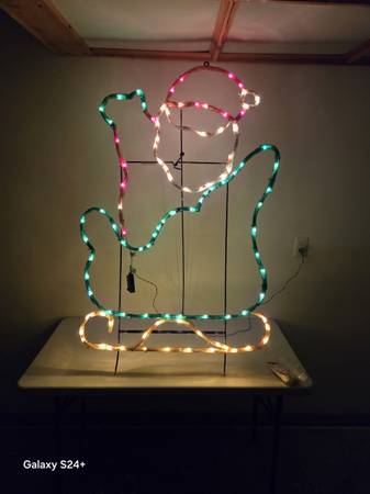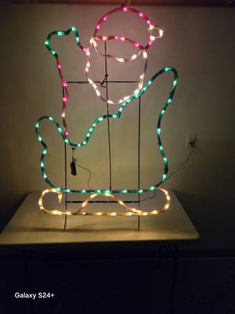 Very rare, Mr. Christmas Light Sculpture depicts Santa Claus in his sleigh. This beautiful multicolor light display will add a festive touch to your holiday decor. This vintage piece was manufactured in 1993 ,this is an early addition with a single rod stand. The original box is in fare condition. The display is in good used condition althought some lights will need to be replaced. Similar models offered on other sites are more expensive and charge shipping, and I will deliver LOCALLY.