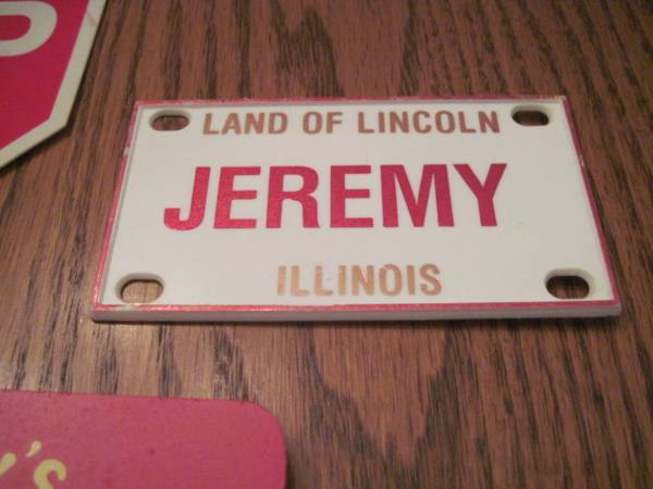 3: Illinois mini license plate. “Jeremy” in red letters on white background. Measures 4”x2”.