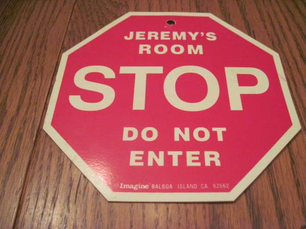 4: Stop Sign “Jeremy’s Room STOP, Do not enter”. White letters on red background. 6”x6”.