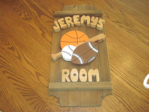 2: Small “Jeremy’s Room” hanging pendant. Measures 5”x2-1/4”. Red background with 3D tennis shoes, plus football, baseball and basketball logos.