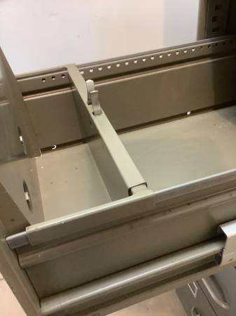 Heavy-duty steel filing cabinet made in the USA. Manufactured by the Remington Rand Co. This Kompakt model is 60 inches high, 15 inches wide and 28 inches deep; it is gray in color. The cabinet was in the E I. Dupont Cellophane Co., Clinton, Iowa. May be from the 1980s, possibly even older. Cabinet is very