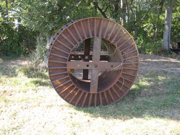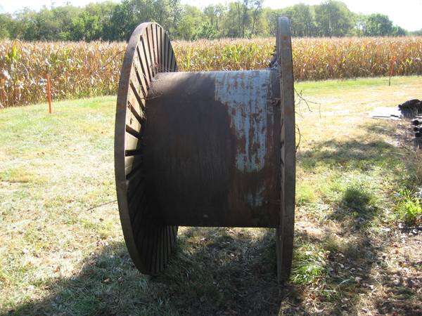 STEEL WIRE SPOOL LARGE SPOOL 6-1/2 FEET DIAMETER THIS IS A STEEL LARGE WIRE SPOOL IT IS ABOUT 6-1/2 FEET IN DIAMETER AND 3 FEET WIDE. IT IS STILL USABLE FOR ITS INTENDED PURPOSE OR REPURPOSE IT FOR...