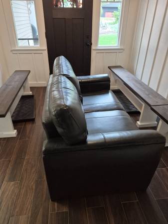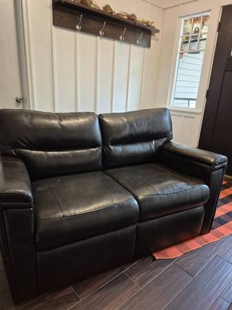 The Loveseat was removed from a Grand Design 2600 RB Camper. The material is a faux leather and dark brown in color. It is in very good condition. The Loveseat is also suitable for your home.