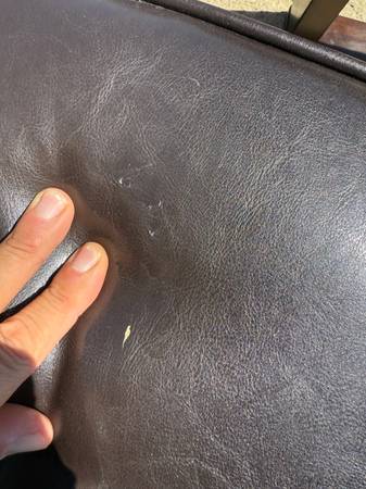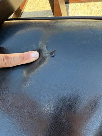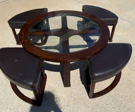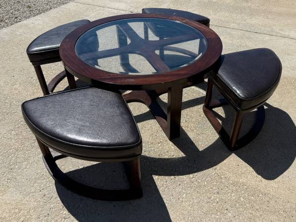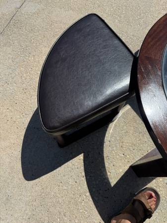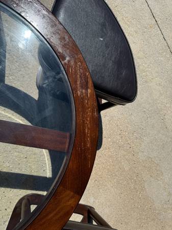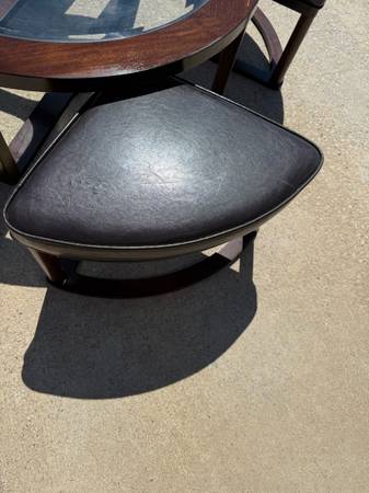 Good shape and smoke free home. Does have some wear of the finish one one are on the top of the table, please see photo. Two of the seats have a small rip, please see phot. Measures 40 inches in diameter and 17 inches tall. More pics available, ask and I will send.