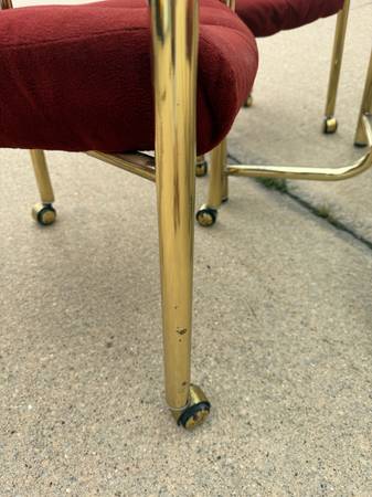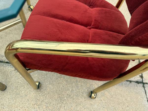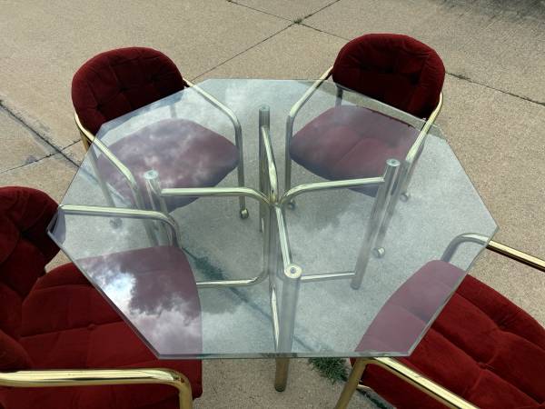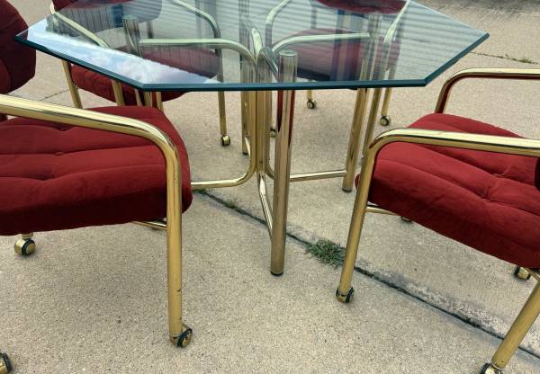 Vintage chrome tubular glass table with matching deep red velvet chair set. Set of four chairs with wheels for ease of movement. Both table and chairs have a gold metal chrome look. Perfect retro look that can be a good fit in a dining room or kitchen. Vintage but looks like it could be out of a CB2 catalog.