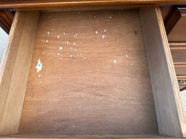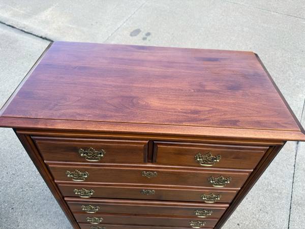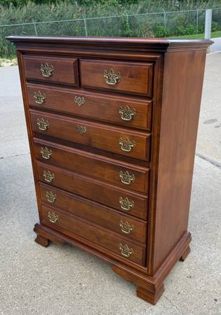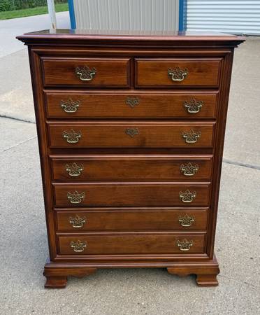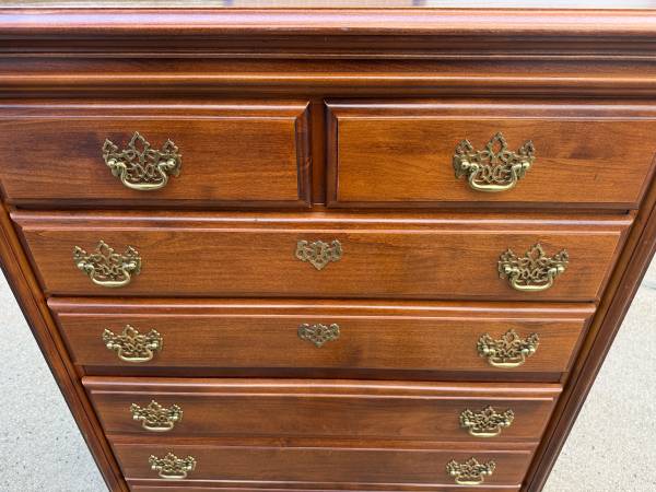 Excellent condition and smoke free home. However the bottom two drawers have a plastic part that is broken so if you pull the drawers completely out they tip. Measures 35.5” x 19” and 50 inches tall. Matching longer dresser posted in another listing.