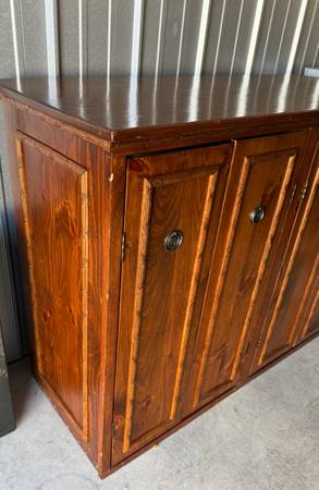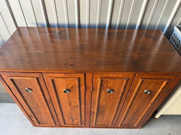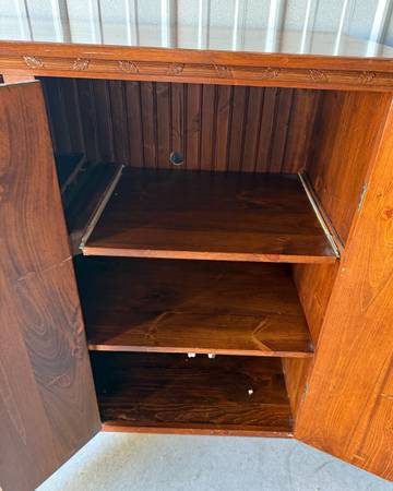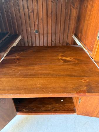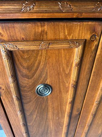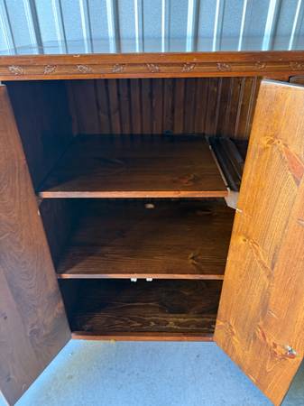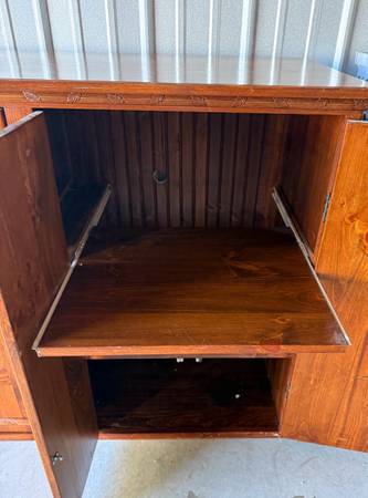 Good shape and smoke free home. Small chip on side, please see photo. One of the little circle decorative pulls on the door is missing, please see photo. One of the shelves pulls out. Measures 52” x...