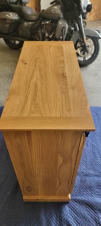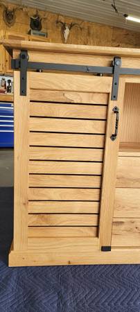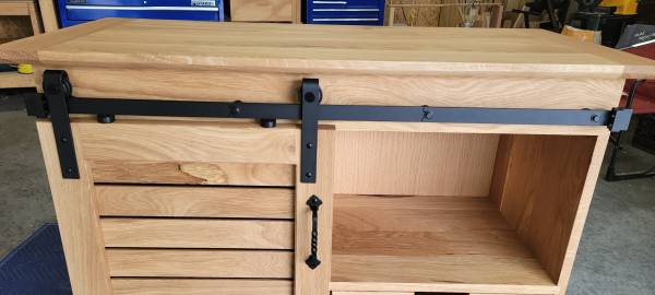Very heavy and made to last solid white oak multi purpose cabinet. 2 adjustable shelves, 3 drawers with soft close undermount slides and Baltic birch plywood boxes. Inside drawer dimensions 15 3/8 X 11 X 3 1/2 deep. Sliding barn door with black hardware, sits on 4 rubber feet.
