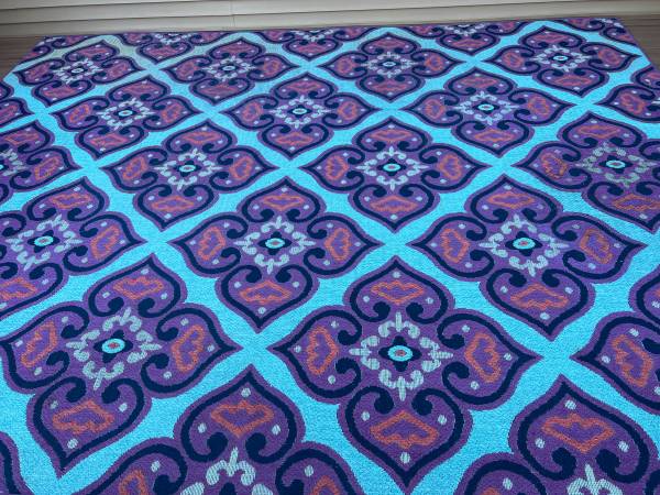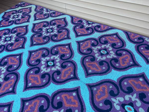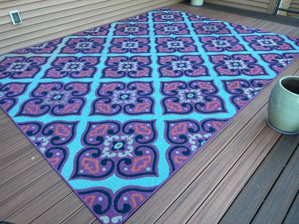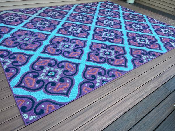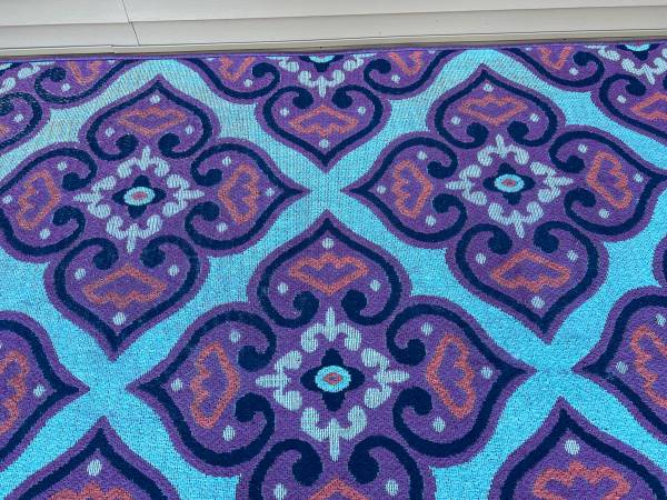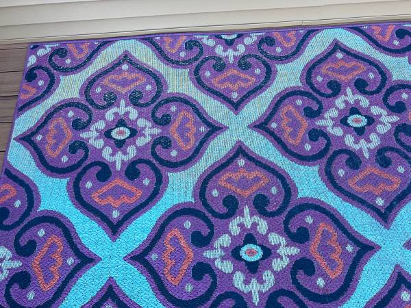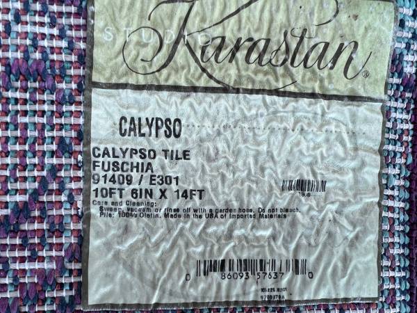 This listing is for a beautiful, large scale Karastan Calypso outdoor rug in size 10.5’x14’. There is some wear along one side of the rug and a few small stains(see detailed photos). The rug was purchased through GrandinRoad catalog and retailed for over $450.