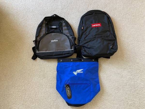 2 brand new never used backpacks (zipper compartments) and both never used. Also beach cooler pack with original tag. Non-smoking home. $5.00 each. Purchase one, two or all three. Firm on prices....