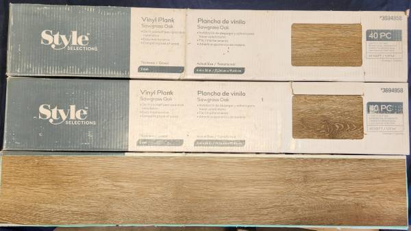 Style Selections Vinyl Plank flooring, Sawgrass Oak colored. New in box. Stick on. 6 inches by 36 inches. 2 mm thick. 40 pieces per box. Covers 60 square feet. 3 boxes available. $70/box or $180 for...