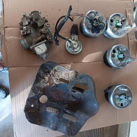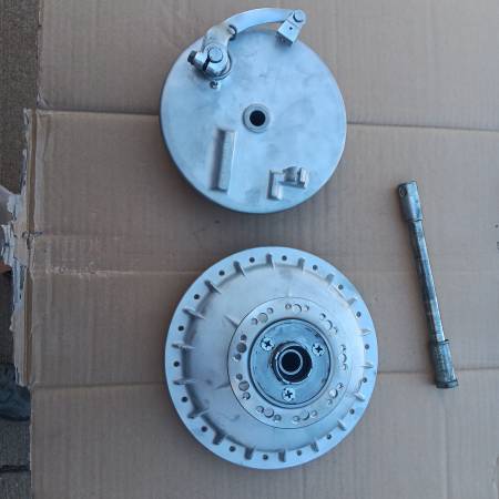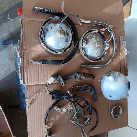 Good used parts, I cleaned them up for you. Bead blasted hubs front is ready to install the rear needs bearings. Really nice front rim, rear is good. I have battery box, I guess air box top, taillight, front head light mounts (3), rh handlebar control. tach and speed-o mount. 1 taillight and another taillight mount I think came off cl350, don't remember for sure. wiring harness in good shape, real nice chain guard.