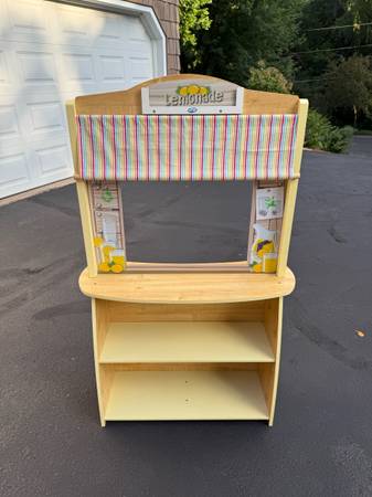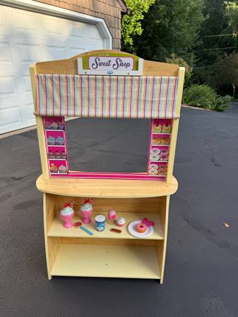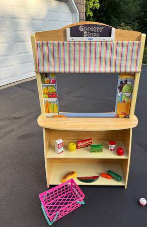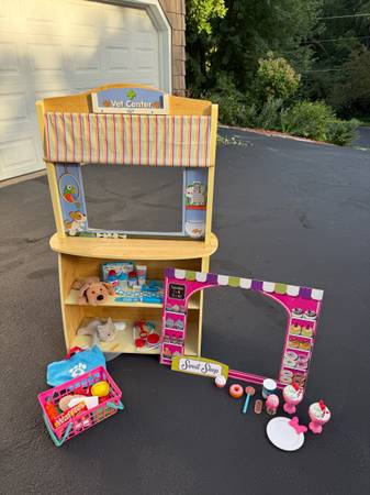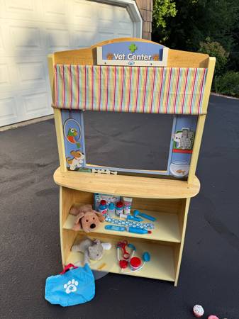 Good shape and smoke free home. Mild wear. Change out the back easily and becomes 4 different stations. Comes with everything pictured. Basket of food is wooden Melissa and Doug and the vet items are also Melissa and Doug. Great for daycare or school. Measures approximately 32” x 12” and 50 inches tall