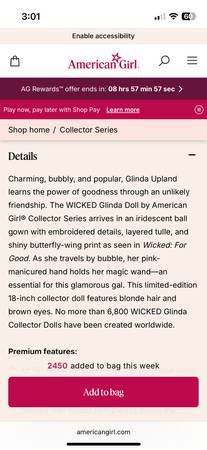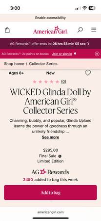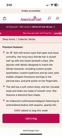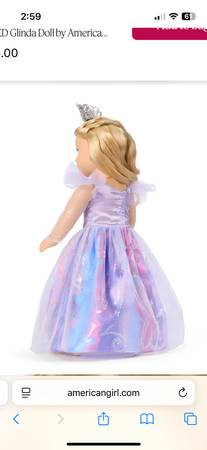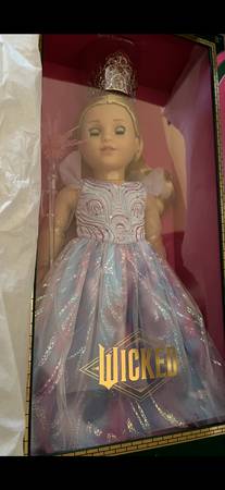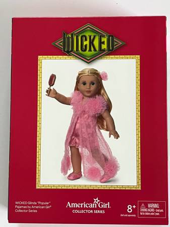 American Girl Wicked Glinda doll, new release; NIB NRFB; just received from AG and decided not to keep it; can’t return to AG because it a limited edition non-returnable; no flaws; removed tissue paper from doll box only. Also included are Glinda’s Popular Pajamas, NIB NRFB purchased from AG. Local pick up or delivery only. Glinda doll now “Sold Out” on AG website.