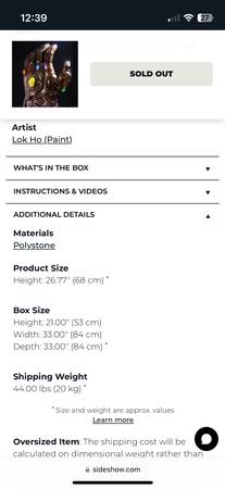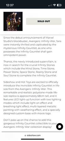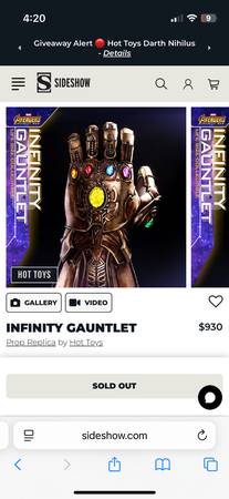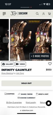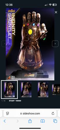 Sideshow Collectibles Infinity Gauntlet 1:1 scale prop replica NISB; purchased new from Sideshow; retail price $930 plus tax&shipping. Local pick up or delivery. This is not to be worn; just...