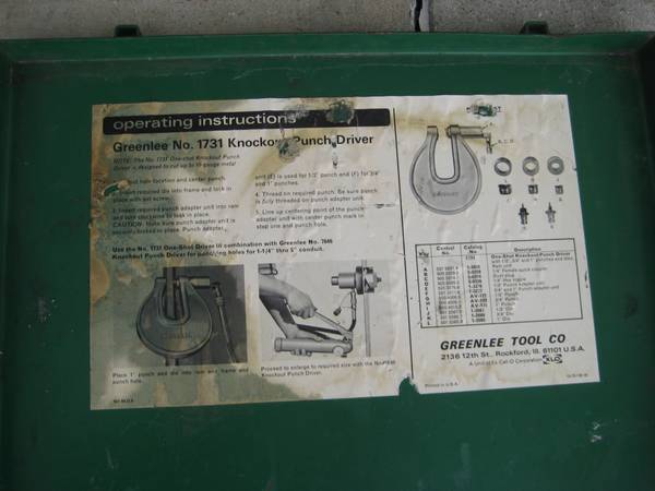 GREENLEE PUNCHES PUMP ETC 1731 PUNCH 767 PUMP KNOCKOUTS STUDS GAUGE BOXES YOU ARE BUYING ALL OF THE PICTURED GREENLEE PRODUCTS HERE ARE SOME OF THE HIGHLIGHTS. 1731 PUNCH FRAME AND CYLINDER 767 PUMP...